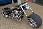 Paul Humphrey"s Fat Boy, Taylormade Swept 3 spoke 10.5 x 18 rear, 280 tyre, Taylormade pulley brake, Taylormade Spondon arm, Taylormade R1 USD conversion, Taylormade 4.5 x 17 Swept 3 spoke front, 160 tyre, Taylormade discs, Harrison billet calipers, Taylormade mudguards. |